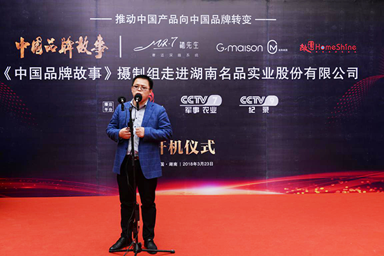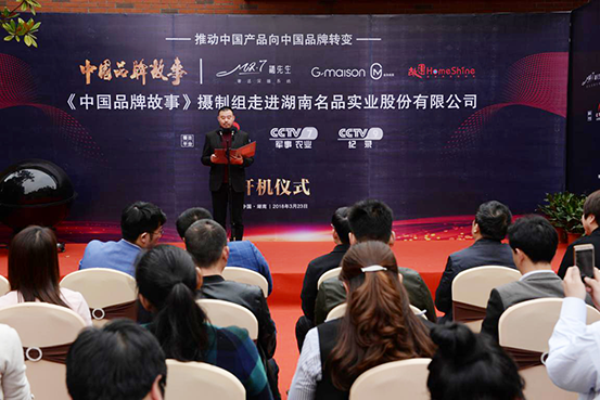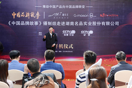 2018年3月23日下午,以讲述品牌故事、传播品牌声音、提升品牌形象为主题的品牌文化纪录片《中国品牌故事》,走进湖南名品实业股份有限公司开机仪式在国家历史文化名城湖南长沙隆重举行。长沙市政协副主席、市工商联主席、市总商会会长彭继球,长沙市岳麓区政协副主席、岳麓区工商联主席卜茂荣,《中国品牌故事》总制片人杨峰、栏目选题副主任张明磊、节目导演商蓝青,以及名品实业董事长周立、总经理张弢及特邀行业嘉宾出席了本次开机仪式。